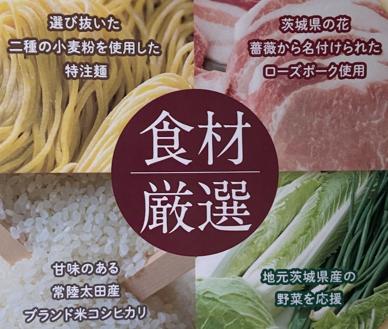 豚肉はローズポークを使用しており、茨城県の県花「バラ」にちなんで名付けられた銘柄豚です。弾力があり、きめが細かく、柔らかい肉質が特徴です。